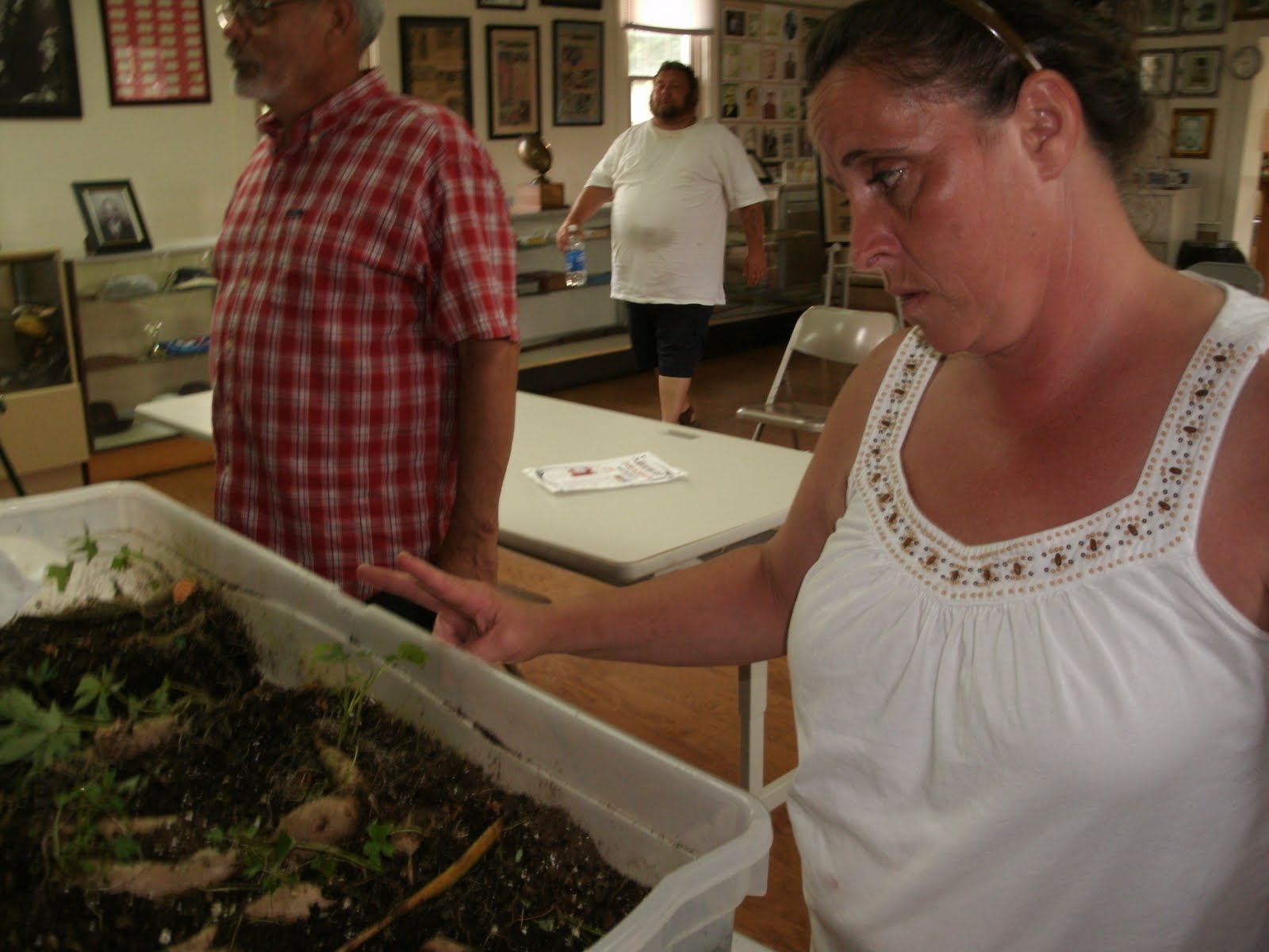 One of our workshops in June was presented by Master Gardener, Cody Thompson, who not only shared with us how to raise your own sweet potato slips, he gave us some that he grew, to plant in our gardens. Cody told us that it was very simple. You take a box and add soil. Next you place the sweet potatoes in the soil nearly covered. Add lots of water to make very moist and cover with a clear top. Before you know it, you will have slips ready to plant.