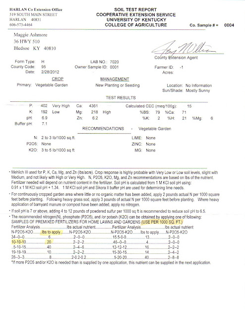 It is time to begin getting dirty, and turning over new ground. I plowed the first Grow Appalachia gardens yesterday and have been turning over the wetter beds at PMSS with a shovel. It feels great to be out the gardens, with dirt all over my arms, and sunburn. Almost every Grow Appalachia participant has dropped by with a bag of soil for me to take to the Harlan County Extension Service for testing, and we have received quite a few of these back. I am thrilled to see that these participants are holding up their end of the bargain (I have held seeds hostage until I see soil)…