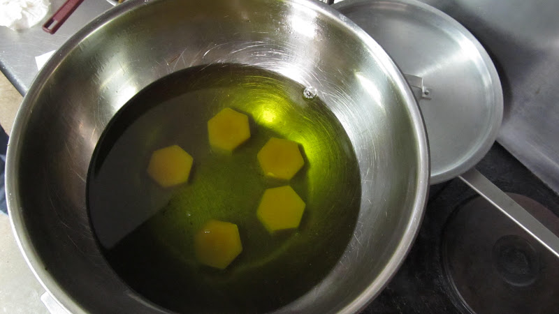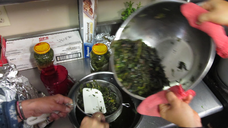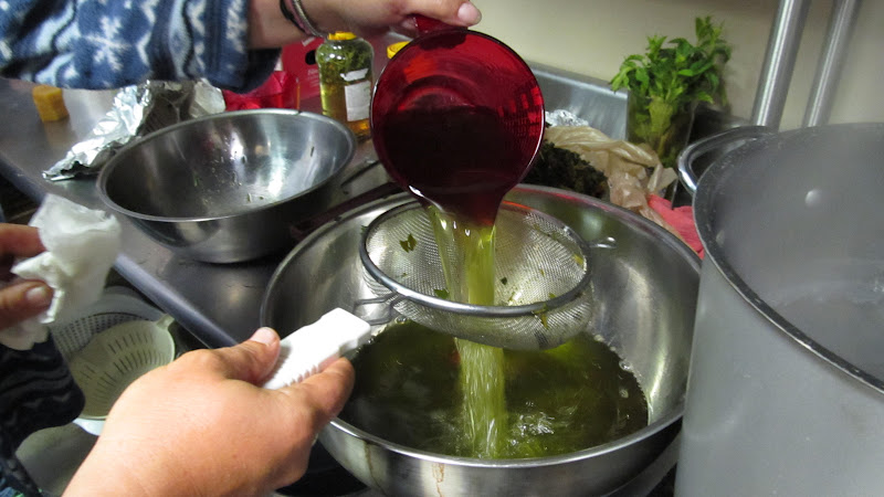 To make the salve, we harvested these herbs from the garden and roughly chopped them . We added coconut oil and olive oil and brewed the mixture in a double boiler for an hour. We then strained the infusion (twice) and put it back on the double boiler with beeswax. Once all of the ingredients were melted and stirred, we poured it into jars and allowed it to cool…and Waaa…Laaa! Salve is complete.