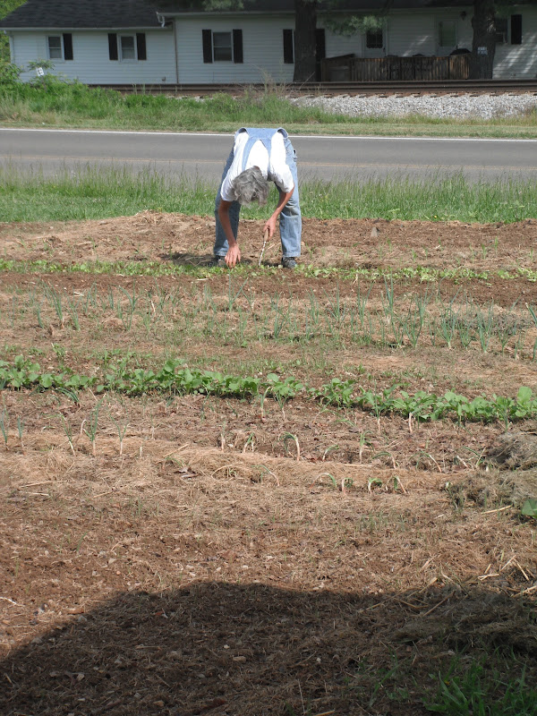 We have organized set dates where we will be in the garden working with volunteers on maintaining the place. We have two gardens left to till out of 22–yay! Jody, pictured above, is a local gardener with a degree in horticulture. Her dedication to the garden is refreshing and I love working with her. We hope that as people get used to us being in the garden on these set days they will come by with questions and come to work and learn. We have printed up more brochures about the project to distribute to local churches to hopefully gain more volunteers. We have a lot of potential volunteers–several college students are interested and once exams are over they hopefully will be regulars we can count on. We have set up some work days with children 12-15 during the summer. We are doing all we can to make this template garden a functioning educational garden. We are also working with some high school students to create some educational and artistic garden signs. Everything growing is still in its beginning stages, and our potatoes are doing the best. The difference in the moisture level and weed level underneath the mulch is astounding–I strongly suggest growing potatoes with straw, and mulching your pathways, and all around your growing plants with leaves, grass clippings, etc. Luckily we know a mower and he supplies plenty.