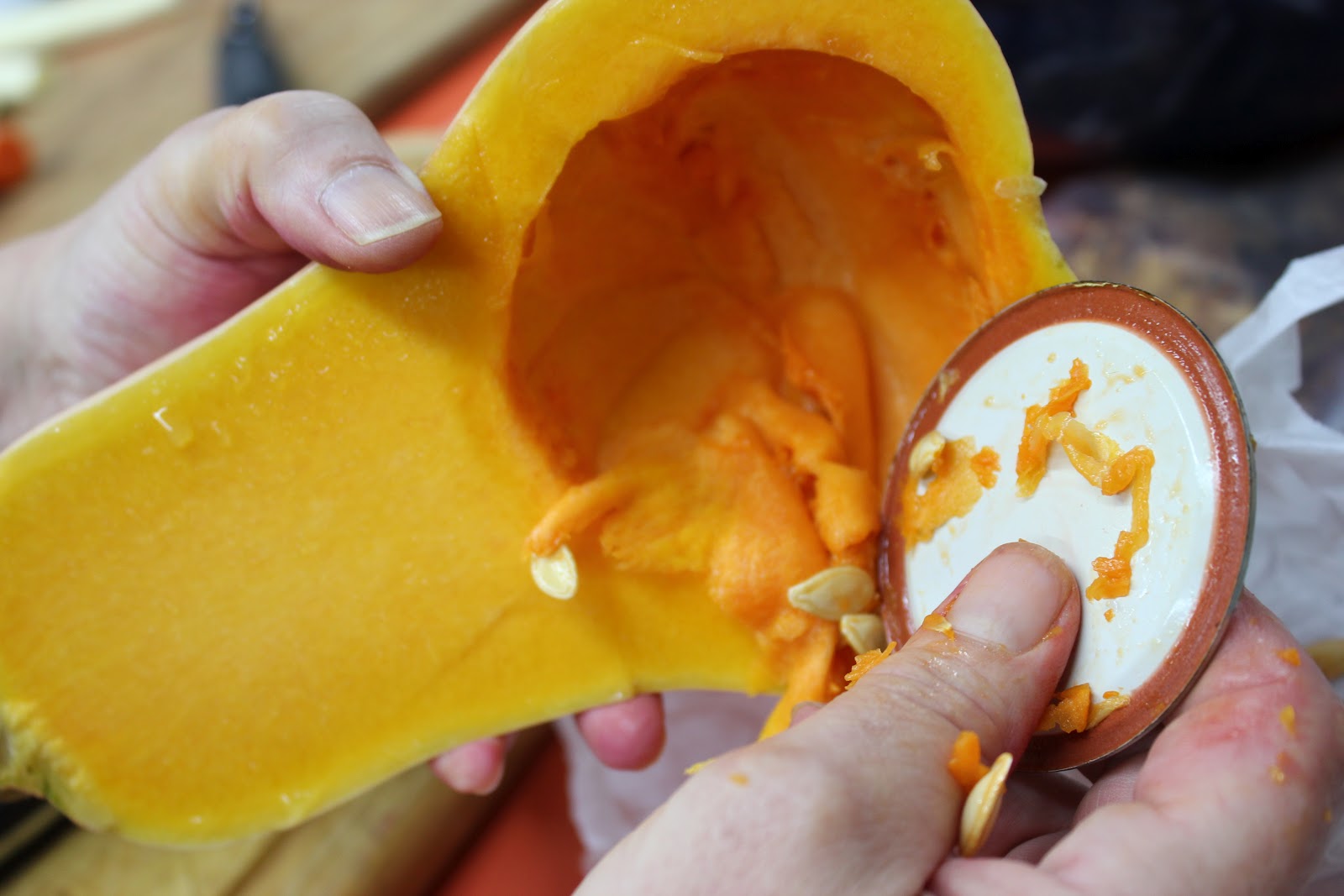 If the health benefits aren’t enough, butternut squash is absolutely delicious and easy to cook. One of the most annoying parts about preparing any winter squash for cooking is removal of the seeds. One of my good friends, Eliza Hudson, showed me a wonderful trick that makes this step painless and quick. After cutting the butternut in half (and peeling if need be), use an old canning jar lid to scrape out the seeds. I know this doesn’t sound all that exciting, but believe me – it is amazing. Please try it.