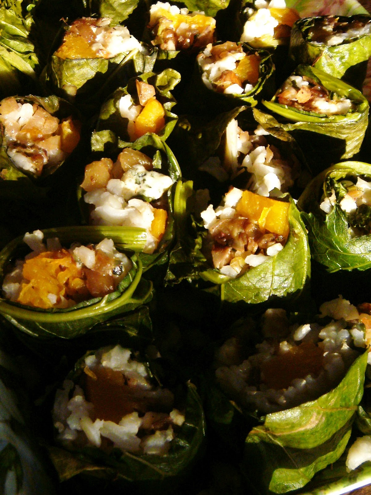Cut steamed leaves down the center vein. Make a 1inch line of rice and nut mixture at the end of a halved leaf. Add 1 or 2 strips of butternut squash. Roll as tightly as possible from the filling end. Cut the roll in to 1in. pieces with a very sharp knife.