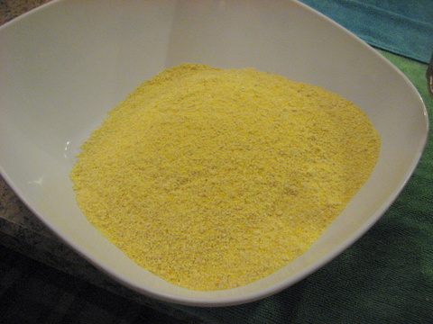 This is the cornmeal after 3 passes, we ground 4 ears of corn and got 6 cups of cornmeal.