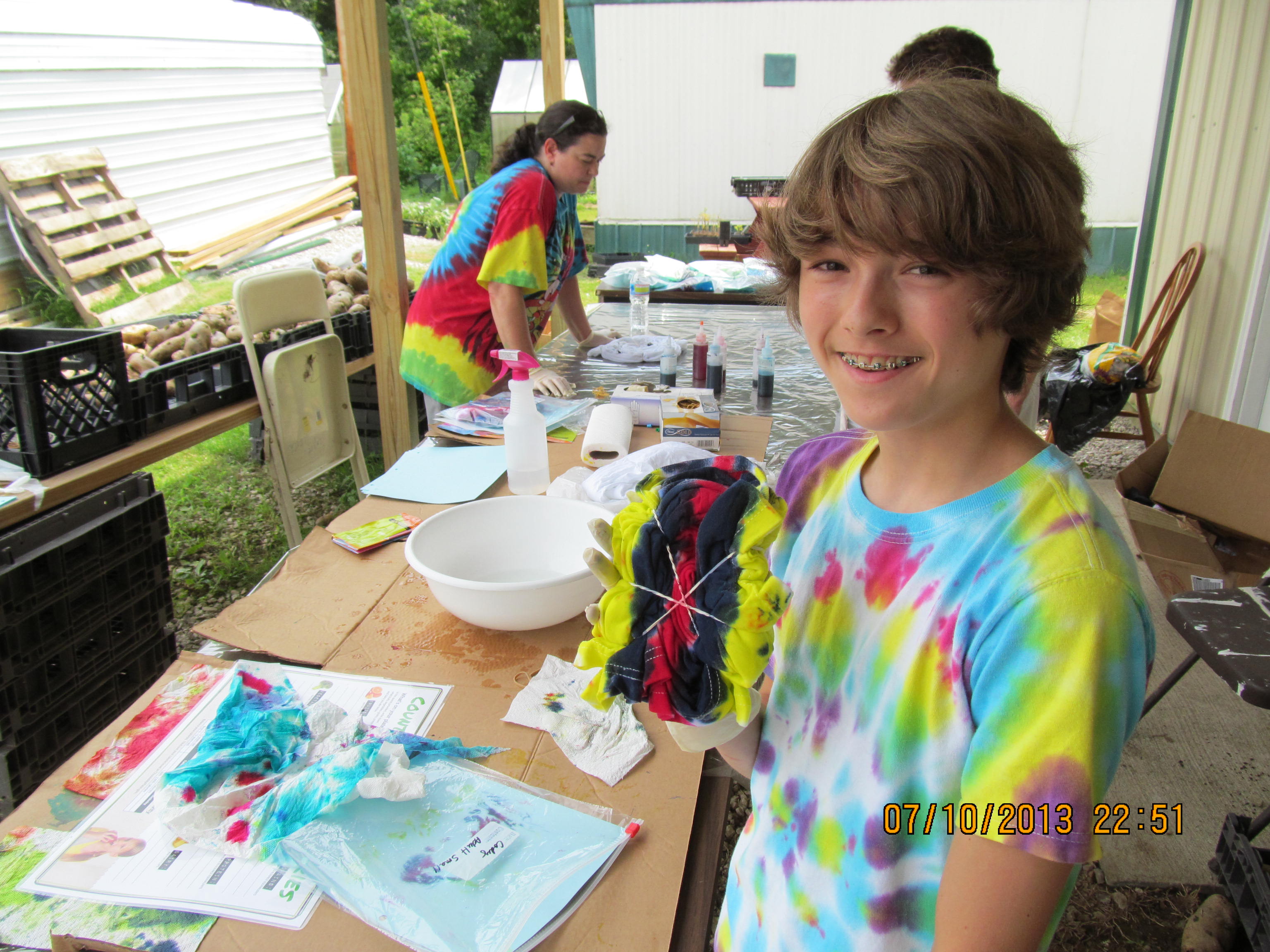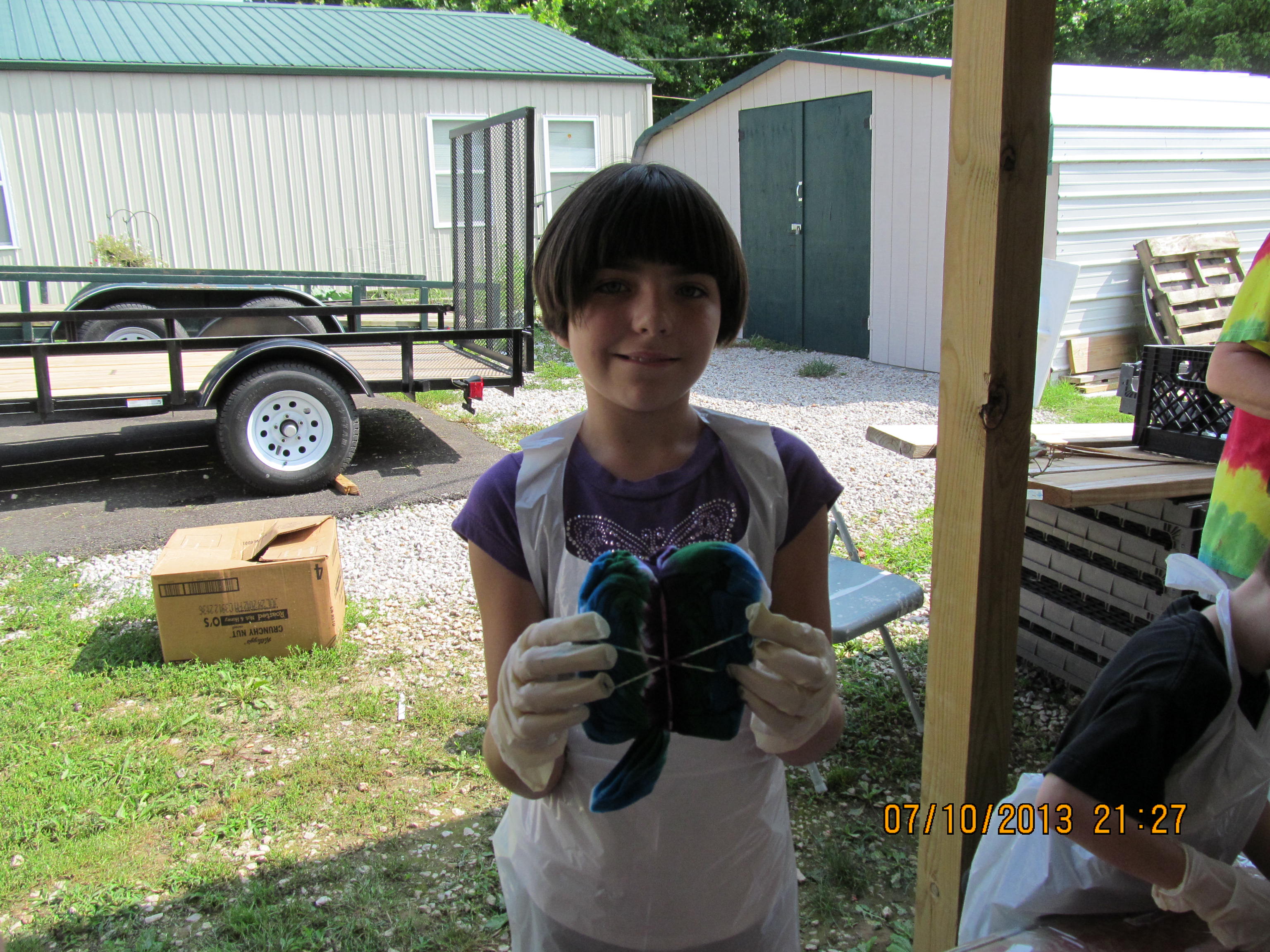 On Wednesday, the last day of camp, the kids made tie dye shirts. I told them about how people used fruits, vegetables, bark, wood, etc. to make dyes thousands of years ago. I also told the children that some people still use natural dyes today. The extension representative made fruit pizzas with the campers. A representative from KHEAA came and talked to them about careers and played a game called career charades with them. She gave each child a coloring book about college attendance and a key chain. After lunch, we took group pictures.