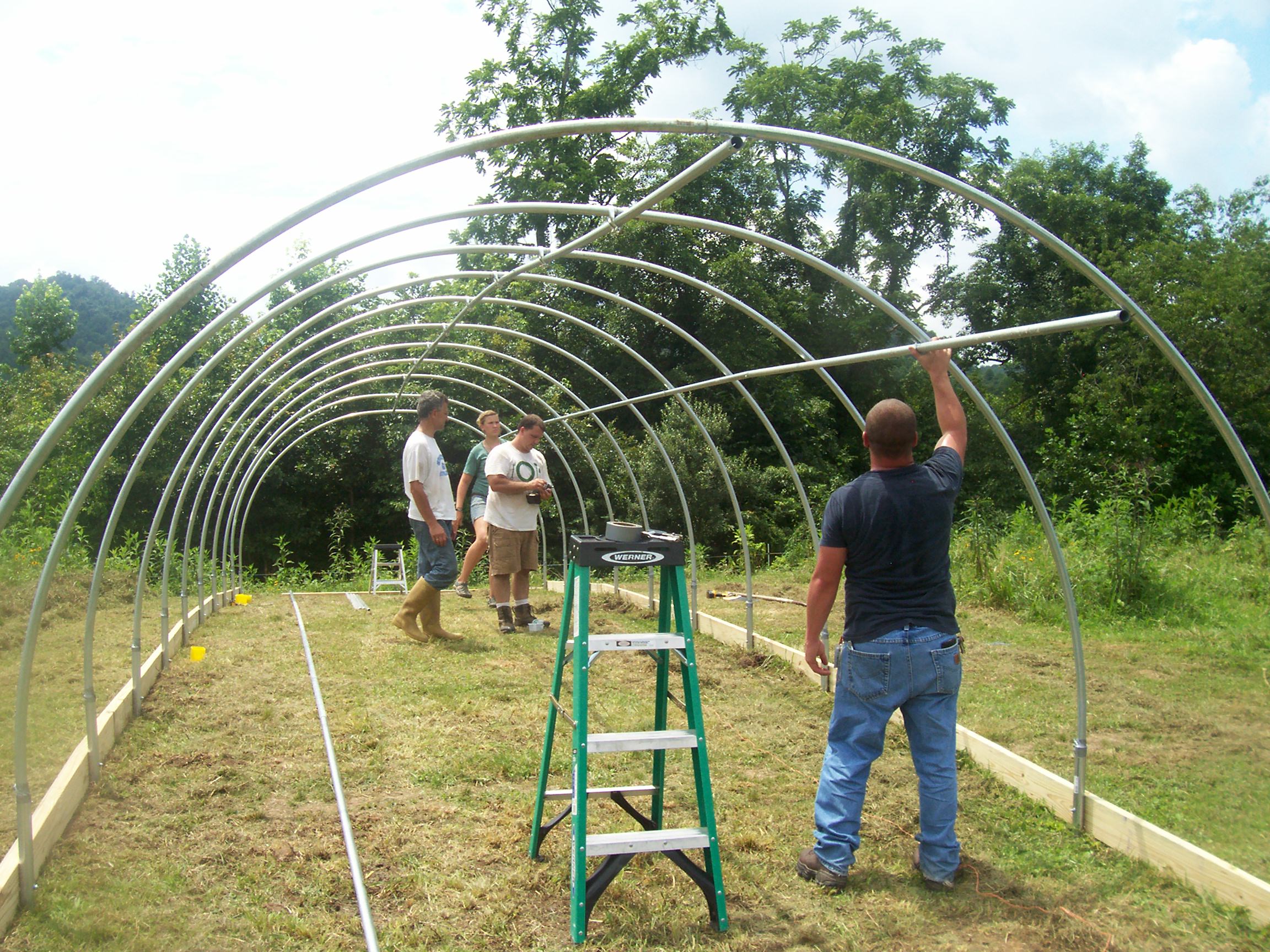 This week we were blessed with the presence of Mark Walden,Grow Appalachia’s Assistant Director, and Lindsey Harper,Grow Appalachia Intern, to work with Chip and I on constructing a high tunnel for the Wolf family. Coming from a background of construction I was excited in two ways, one just learning how to build a high tunnel and of course there was the benefit of giving this family of eleven something I knew they both needed and would utilize to its full potential.