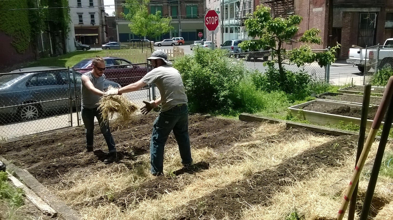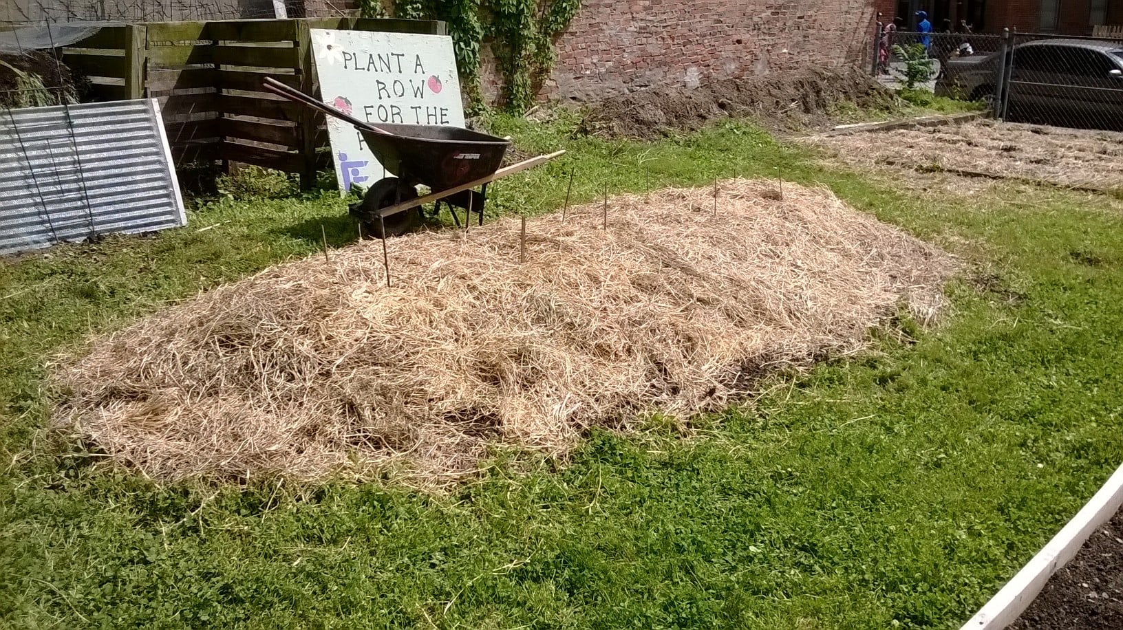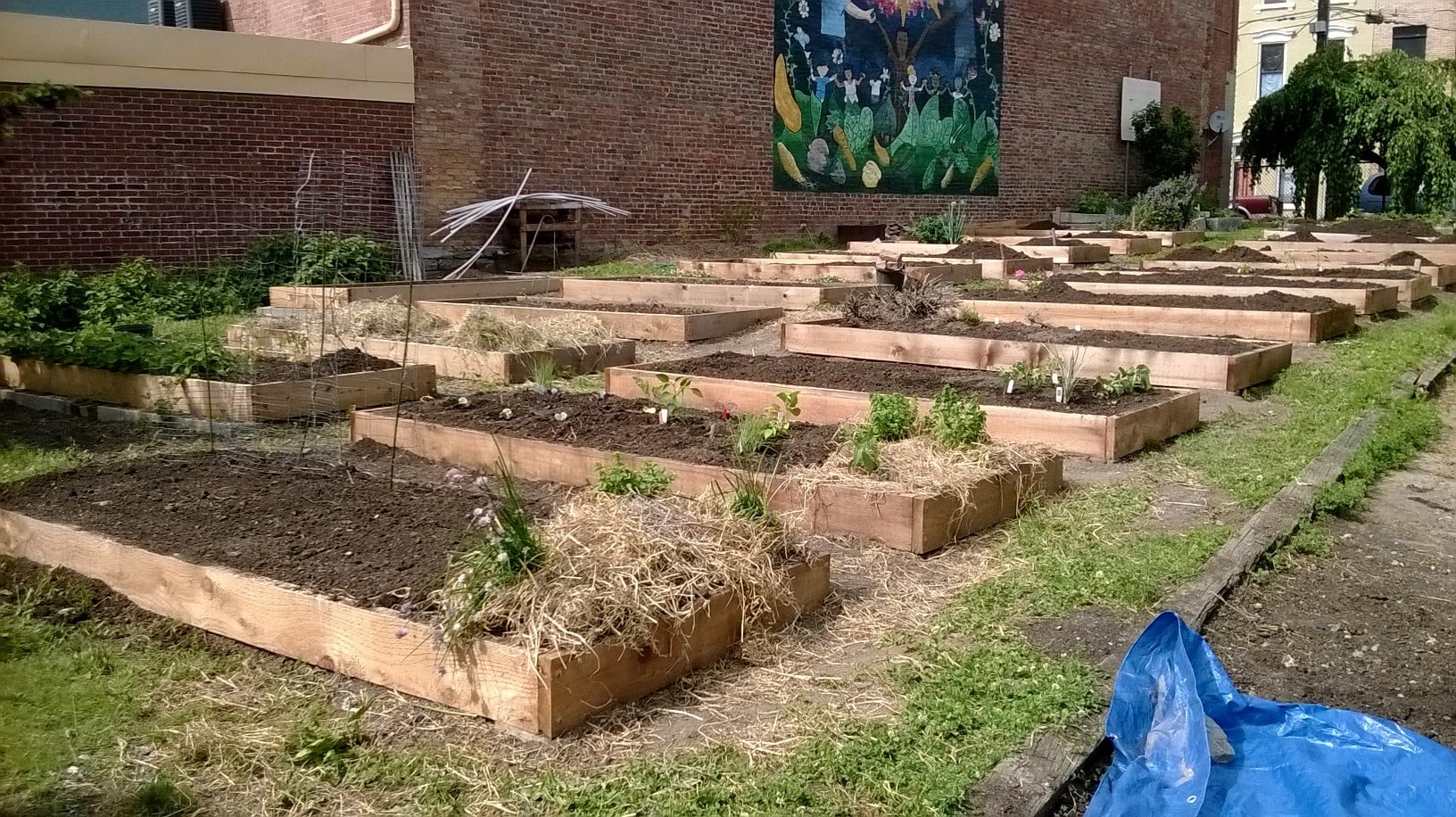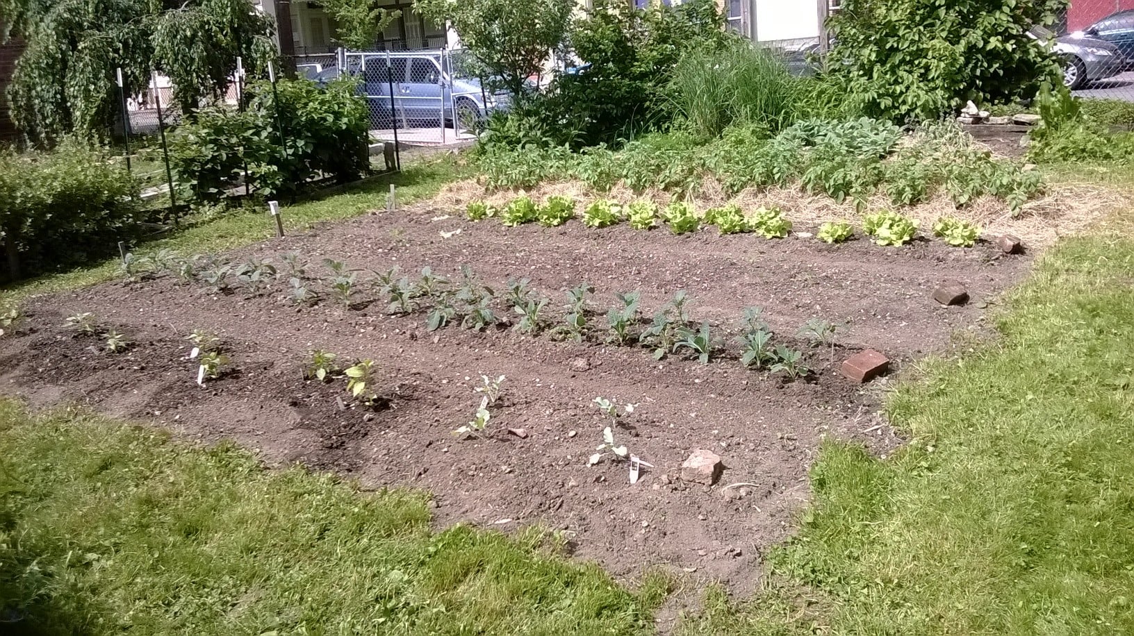 Happy Memorial Day! We had a great workday Saturday at the Over-the-Rhine People’s Garden. We added manure to all the raised beds and started planning the 4×8 foot children’s bed. We also planted the sweet potato slips and peppers, weeded around the Asian pear tree, and mowed. Plus we did lots of weeding – the first bin in the compost area is now full! It was a fun group to work with and share a potluck meal. Hope everyone else had a beautiful weekend in the garden!