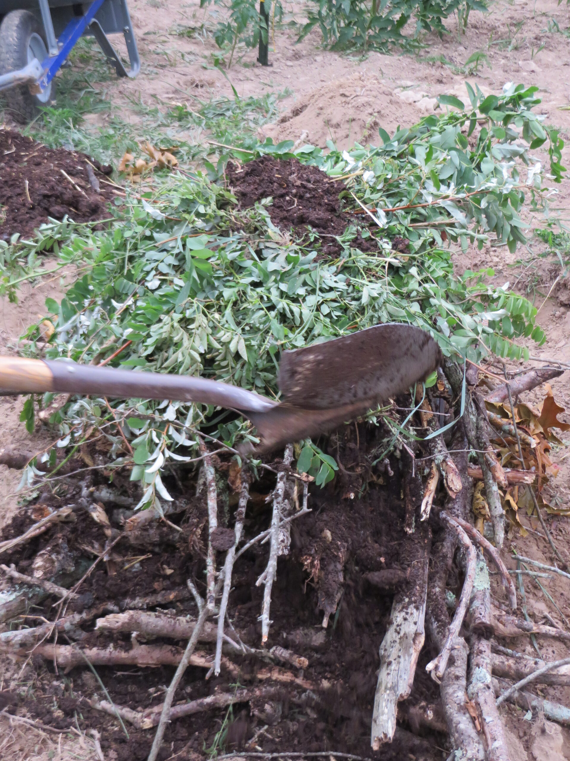 Then, we built a hugelkultur (‘hill or mound culture’ in German) bed. We collected sticks from the nearby forest and lay them down in our proposed site. Then we layered freshly picked weeds, dirt and manure on top. We didn’t have quite enough dirt for the top but I threw some buckwheat seeds there anyway just to see if they’d grow. The hugelkulture bed is supposed to break down into a very nice raised bed as the wood decays and rots. The rotted wood acts as a sponge that soaks up rainfall and then releases it slowly to the plants grown in the bed. It isn’t supposed to be a good growing bed the first year because the decomposition of the wood at first takes up too much nitrogen but down the road it will be one of the better garden beds and besides time it will hardly have taken any work at all!
