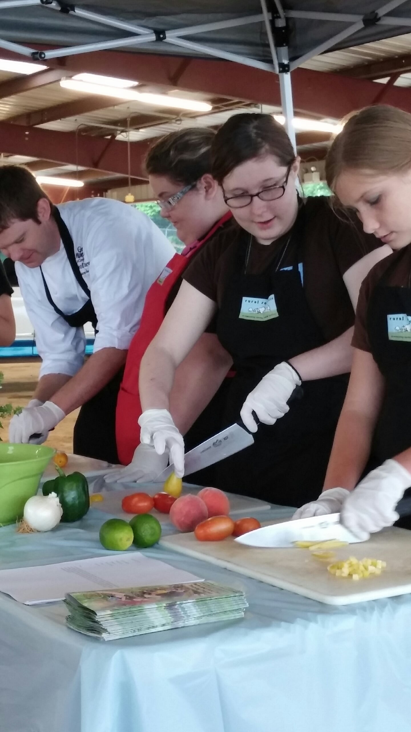 This week has been busy with two major food events for my other teen groups, which I felt I needed to share. Saturday our cooking group, who calls themselves “The Silent Farmers”, greeted our rainy early morning at our local farmers market. There they met up with Chef Geoff, Chef at General Morgan Inn of Greeneville, TN, to set up for a fresh salsa demonstration. They spent two days prior in the week with Chef Geoff learning how to make salsa – he went through all the skills of how to use a knife, how to cut each of the items in the salsa, and made sure each of the teens understood each step. He worked with this group of 7 teens and prepared them to show their skills and recipes at the farmers market. After our local farmers set their produce out, we went around and collected all the local ingredients we needed. The only thing we used that was not local were the limes and salt.