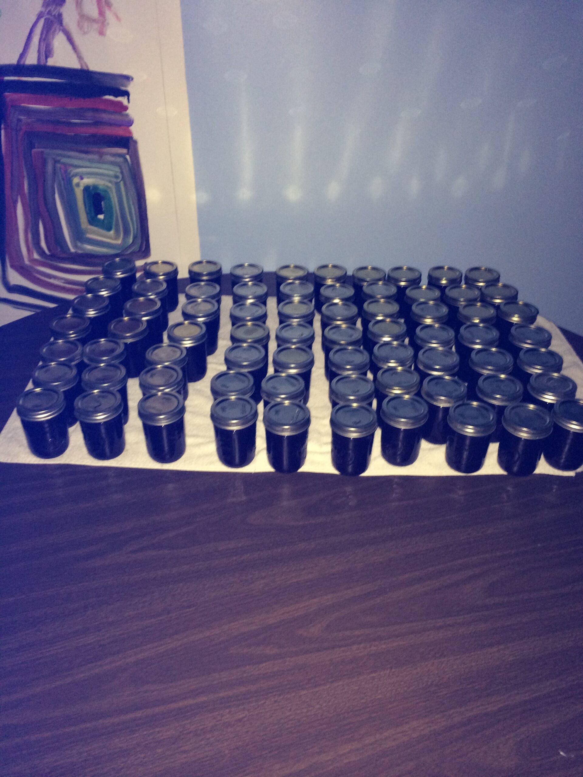 This same neighbor gave us two bushels of the grapes that he has growing. After two days of sorting and juicing them, we canned 70 half-pint jars of delicious grape jelly. I had to can the last 9 jars in the dark, the power went out because of a storm and I was at the point of no return with that batch. They all sealed and were filled to the right level. It’s ok to call me the jelly queen.