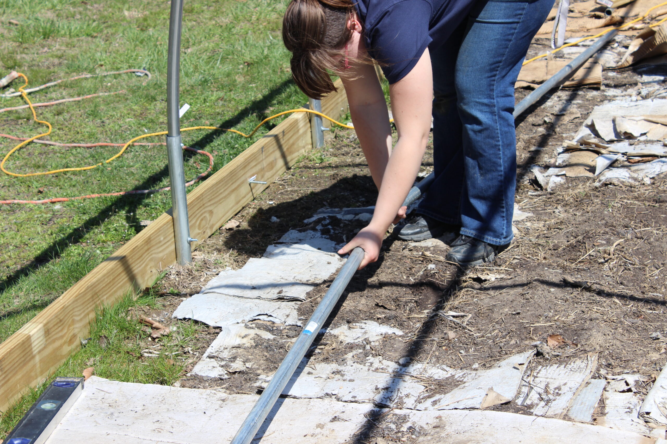 Yours truly drove in ground posts on one side. Let me tell you…I’ve been on quite a few builds now, and THEY MAKE IT LOOK EASY! That 8 pound sledgehammer feels like 800 pounds when you get halfway down! It’s two days later as I write this and I’m STILL sore!