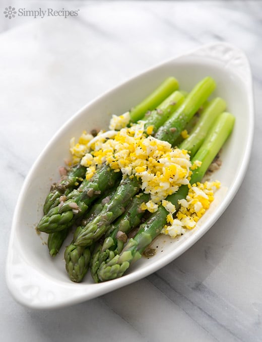 As an eggplant side: Tossed trimmed asparagus spears with olive oil and salt to taste. Roast on a baking sheet at 450 degrees F for 8 – 10 minutes, until tender, top with a grated hardboiled egg before serving.
