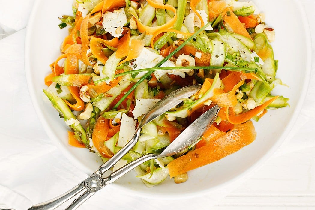 Shaved, in a salad: With a vegetable peeler, shave trimmed asparagus spears and peeled carrots into long ribbons. Toss with olive oil, lemon juice, and salt and pepper to taste.