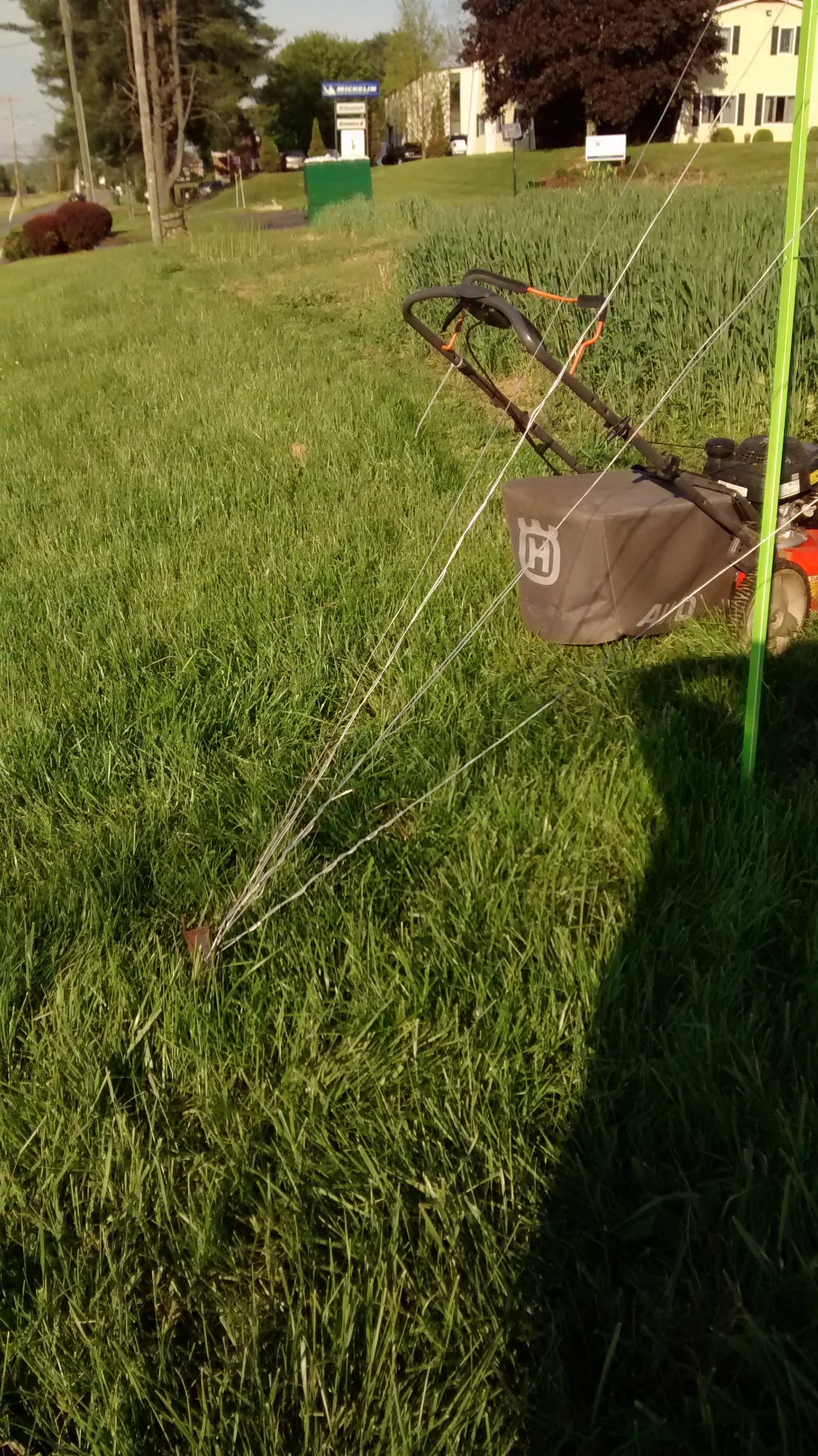 Next, JJ set the wires; using 9 gauge fencing wire.  The trick is to get the wires taught and stay tight using tensioners that are secured to the ground using a ground post.wire tensioner