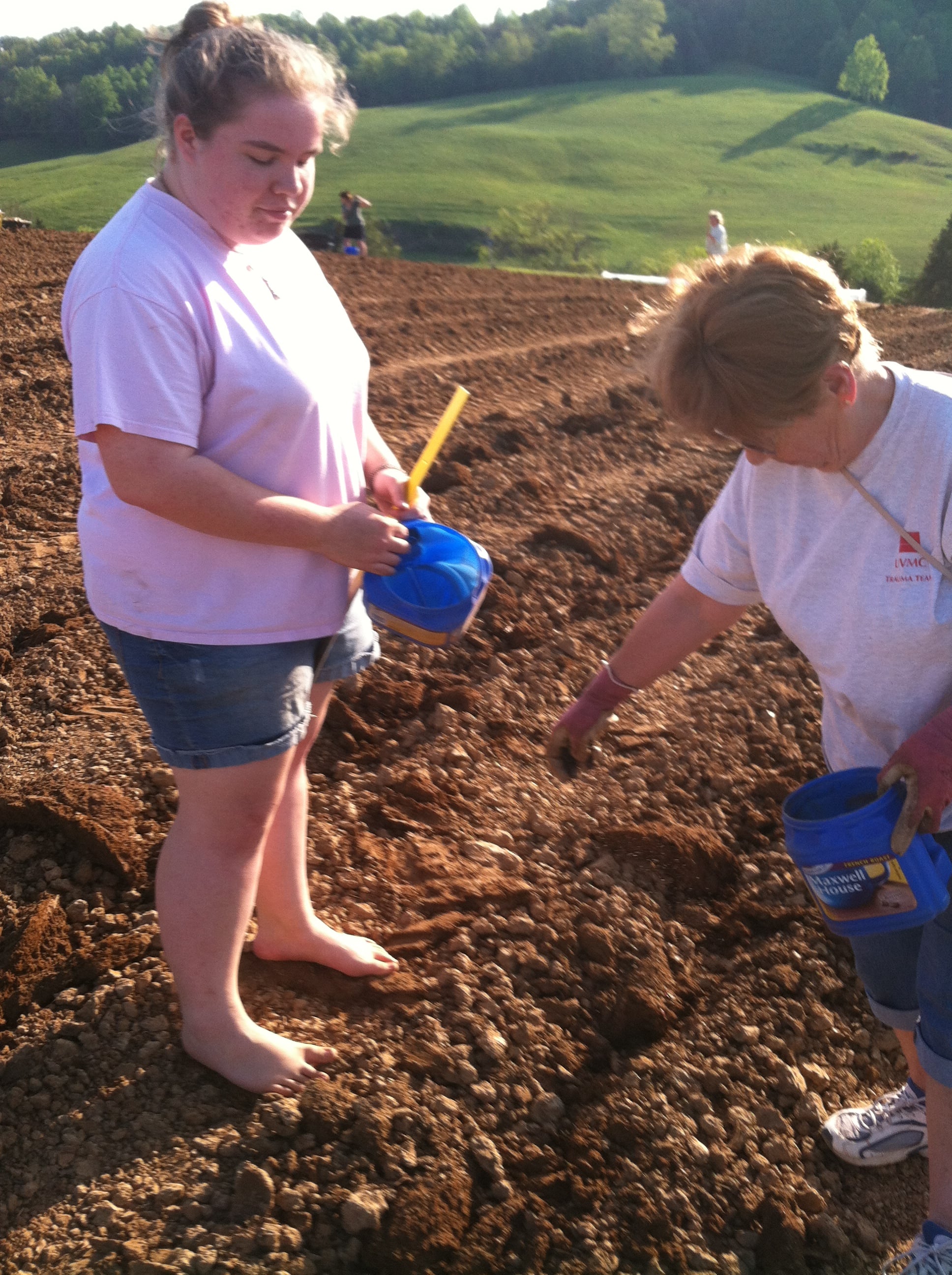 You should see 2 pics of the masses in the field, our teenage barefoot gardener with her planting buddy and Bill on his tractor.