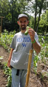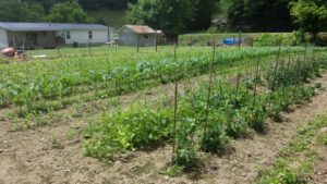 Kenneth Bradley had me visit his garden a month ago and Boy, does it look different this month!! His corn has shot past “knee high by the fourth of July” and is taller than him; his large heritage greasy beans are filling in the bean trellis that he fashioned for them; and his pepper plants are full and coming on strong! The numbers his Scientific mind was throwing out today had me in awe of his record keeping skills (7 years worth!), not to mention the number of corn, beans, and cucumbers he’s estimating! He had a wonderful handed down treasure of a wheel hoe out there too! Kentuckians know how to plow a straight row and bring in the crop!