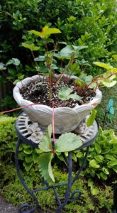 Janet Wells brings a whole different type of gardening to the table and makes it all look effortless and beautiful! She’s got one raised bed full of beautiful veggies and she tucks more veggies in between her flowers and her bushes all around the house. I found sweet potatoes growing in with beautiful flowers in a mutual relationship that suited everyone well, herbs with marigolds, and strawberries in some lovely sculptural pots. Bravo!