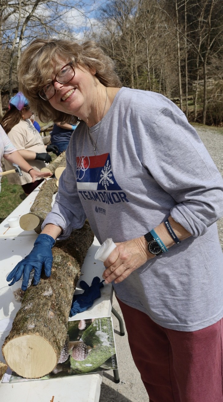 Prior to the workshop, Maggie prepared a mix of tulip poplar and box elder trees by harvesting them from her farm and letting the pre-cut logs rest for about two weeks. This rest time is essential to drain excess moisture and breakdown the tree’s natural defense properties against fungus. After allowing the logs to rest, Maggie used a specific drill bit to insert holes into the wood which would eventually be filled with a starter material for mushroom colonization, referred to as spawn. Maggie concluded her preparation summary by giving participants enough information to prepare their own wood at home and by emphasizing the importance of harvesting trees sustainably.